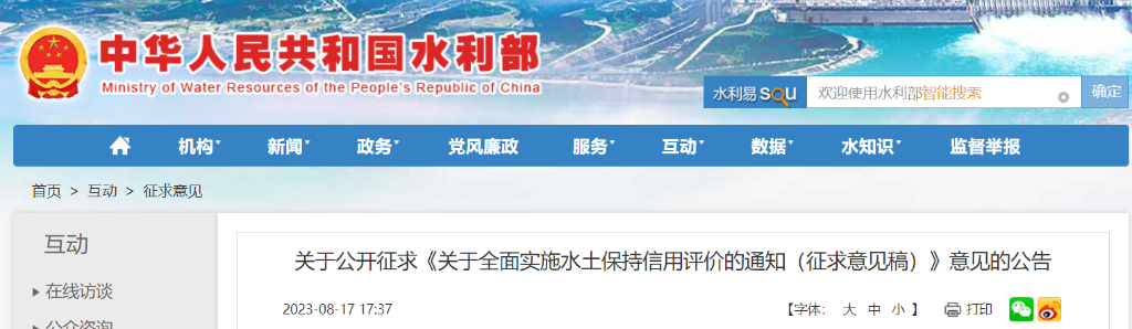關(guān)于公開(kāi)征求《關(guān)于全面實(shí)施水土保持信用評(píng)價(jià)的通知(征求意見(jiàn)稿)》意見(jiàn)的公告